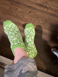 To address the reduced stretch that can occur with colourwork, I’ve added a few extra stitches in the leg section, helping the sock slide over your heel more easily while still hugging the foot snugly for a comfy fit.