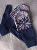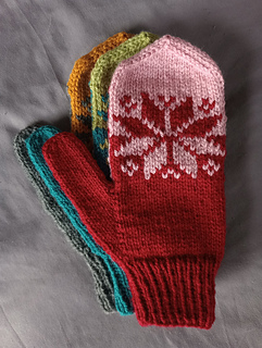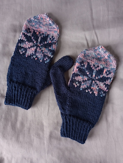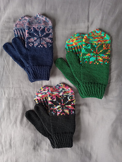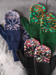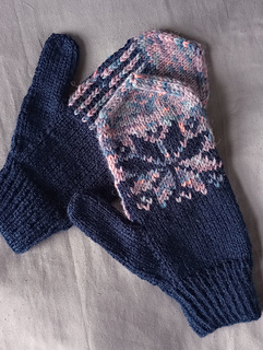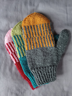 Worked in the round, each mitten is cast on at the cuff and knit down the hand. Along the way, you will increase along one side to create thumb stitches (which you will place on scrap yarn and come back to at the end) before working a block of 2-colour stranded colourwork and then decreasing symmetrically along each side to close the fingertips.