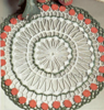Doily in white has green trim, red flower motifs appliqued along edge.