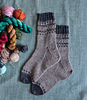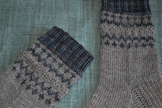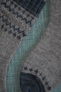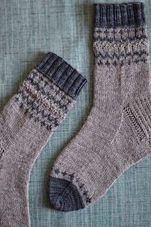 The socks are worked from cuff down, beginning with a 2x2 ribbed cuff for comfort and stretch. A colorwork pattern is introduced on the leg. Midway through the leg, this motif is reinterpreted as a textured pattern worked in a single color, mirroring the colorwork. The colorwork pattern then resumes, and after it ends the rest of the leg is worked in main color before transitioning into foot.