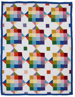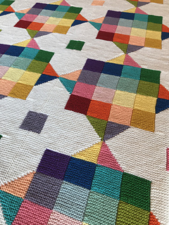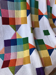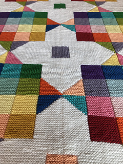 There are two methods for making the blanket. The first, shown in the photos is to make four intarsia strips and sewn them together. The second method uses modular construction with mitered squares. The colored pieces are then joined with the shapes of the crosses finishing with a square worked in the round.