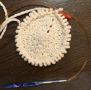 NEEDLES: US 8 (5mm) and 10 (6 mm) long circular needle for magic loop method or set of double pointed needle or size needed to obtain gauge. Two double pointed needles for making the I – cord.