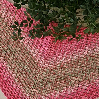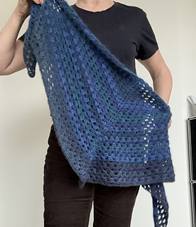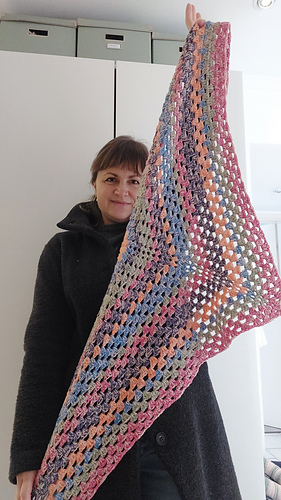 The REGRANNY shawl can be worn wrapped around the neck once and the ends are long enough to be tied with a knot. But you can adjust the size to your liking and make the shawl in any size, yarn weight, gauge and matching hook size.