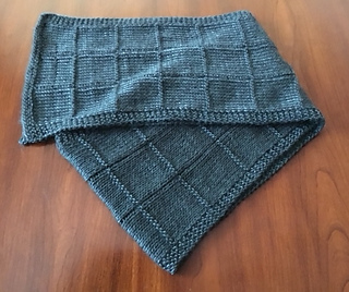 This scarf features an interpretation of the popular afghan squares with the block pattern appearing on both sides. A 5-row garter stitch band anchors the ends of the scarf, and a 5-stitch seed stitch border prevents curling and rolling, ensuring a smooth drape.