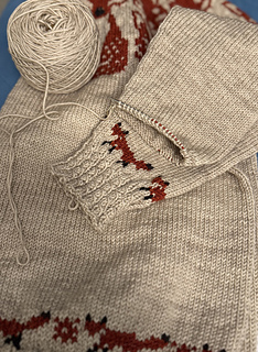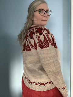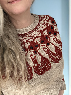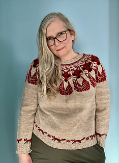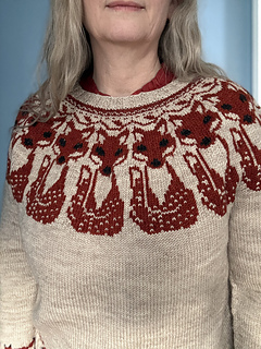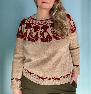 This sweater is knit top down using DK/Sport yarn and US5 (3.75mm) to achieve a gauge of 24 sts x 28 rows over 4 inches (10 cm) of stranded colourwork and 24 x 33 rows over plain stockinette. The sweater has a stranded yoke, hem, and sleeve cuffs. The ribbing is an Eyelet Mock Cable but can easily be changed to a regular rib. The eyes and nose on the yoke fox are duplicate stitched but can be stranded.