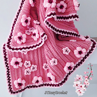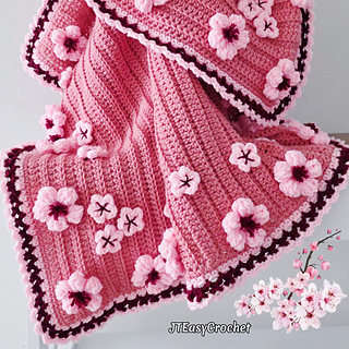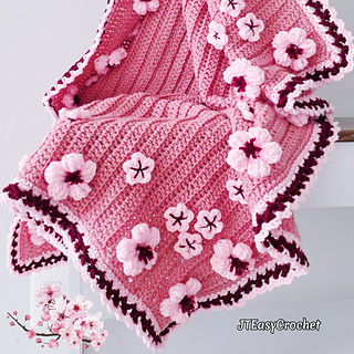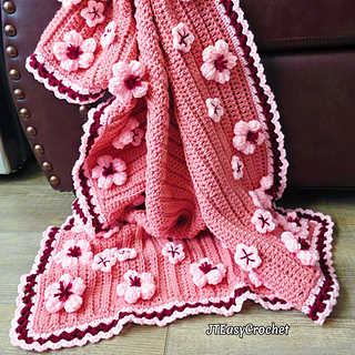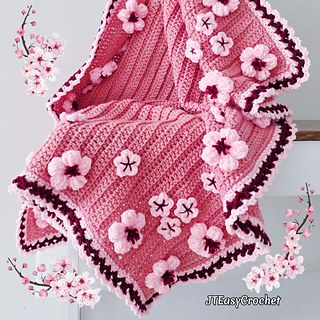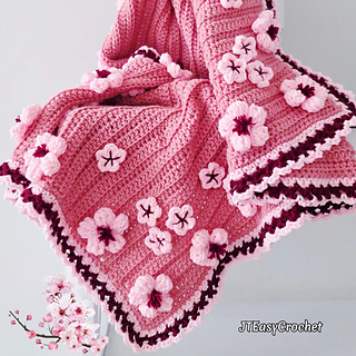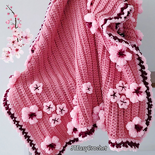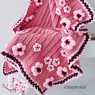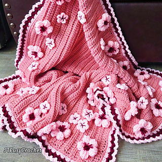Easy Crochet Pattern & Video, Cherry Blossom Baby Blanket And Flower Applique, Ribbed Stitch Afghan, Boho Cottagecore Style Couch Throw