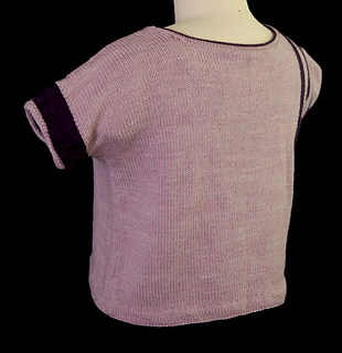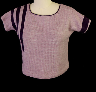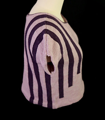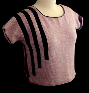 This drop-shoulder top features intarsia ribbons running from the bottom to the shoulder on the front and back. A second ribbon wraps around the opposite sleeve. The top is knit in two pieces from bottom hem to shoulder, with integrated sleeves. Finishing is simple with a folded hem, slipped stitch edges along the sleeves, and a simple neckline finish.