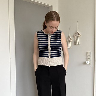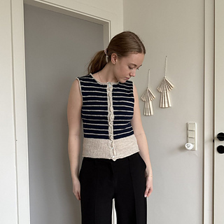 The Rigmor Vest is knitted top down in stockinette stitch with stripes. First, the upper part of the back is knitted with increases. Then the shoulders are knitted from the picked-up stitches at the top of the back piece. The body is knitted back and forth. Along the sleeve opening, a stockinette stitch edge is knitted. Finally, buttonholes and Plain knit edge at the neck. The vest has a two-tone stripe pattern.