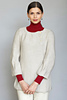 Neck placket is closed with buttons. Neck opening is offset to left of center. Neck is finished with crochet edging.