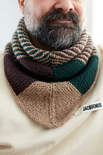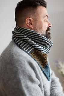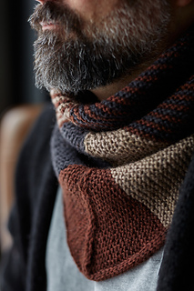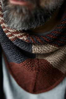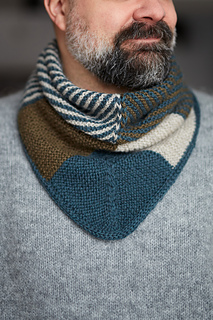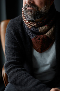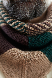 The Rocketeer cowl is knitted in two mirrored garter-stitch panels. Once both panels are complete, they are seamed together at the front and back using a running stitch. To finish, an applied I-cord is worked around both the top and bottom edges of the cowl.