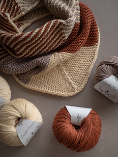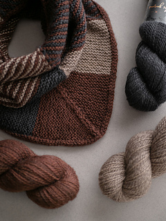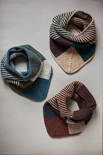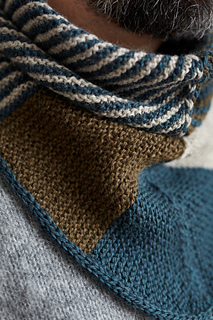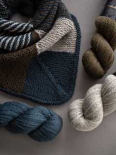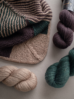 Samples shown in British DK from Les Garçons (70% Bluefaced Leicester Wool, 30% Masham Wool, non-superwash; 263 yd / 240 m per 100 g skein). The purple and green version is knitted using the “Twyla’s Sand” (Colour A), “Carmen’s Story” (Colour B) and “Chris’s Pine Green” (Colour C) colourways. The blue and khaki green version is knitted using the “Édith × Eli” (Colour A), “Max’s Kaki” (Colour B) and “Natural” (Colour C) colourways.