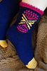 The leg is embellished with a chart pattern featuring Nupp bobble stitches in a contrasting colour along with Roosimine Estonian inlay. The chart pattern is worked on the outer side of the leg for a distinct left and right sock.