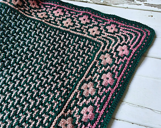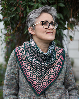 Rose Parade is a slip-stitch colorwork cowl featuring a wide floral border worked in long, striking repeats. The interplay between the dense, textured center and the blooming edge gives the piece its distinctive character.