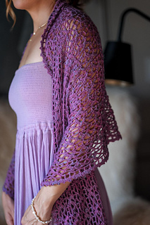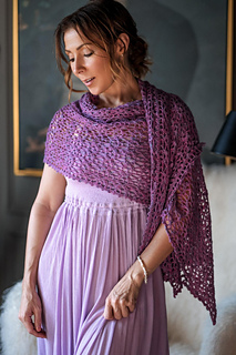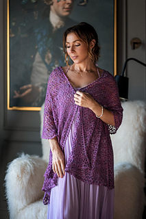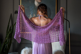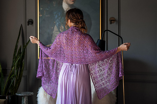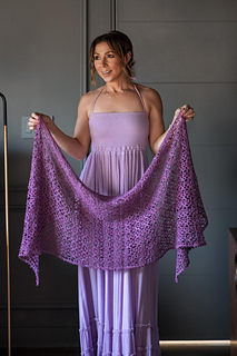 This shawl is a combination of lightweight elegance and delicate craftsmanship. Designed in an openwork pattern with rows of flowers alternating with rows of a simple grid and finished with a dainty picot edging, the shawl adds a touch of sophistication to any outfit. Made from fingering weight yarn, it provides a gentle drape, offering both comfort and style. This shawl is an ideal accessory for breezy evenings or special occasions, blending beauty with practicality.