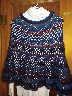 This poncho was created September of 2021 while visiting my daughter in Boston. I crocheted the blue poncho first and it was so quick. I ran to the store and grabbed worsted weight yarn to see how it would work up, and this I found. If I would have gone up one size in the pattern it would have been a perfect.