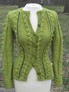 This Victorian-inspired design is a tastefully sexy knit who comes with her own built-in hourglass shape. Black satin ribbon trim traces curves and dimensional cables wind their way over your hills and valleys.