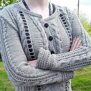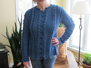 This Victorian-inspired design is a tastefully sexy knit who comes with her own built-in hourglass shape. Black satin ribbon trim traces curves and dimensional cables wind their way over your hills and valleys.