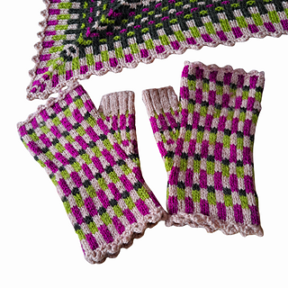 The Ruby Zoisite fingerless mitts were designed to complement the Ruby Zoisite shawl. Also, to use up the leftover yarn - always a bonus.