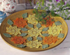 Doily with green irish crochet leaves, orange and yellow motifs.