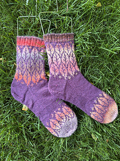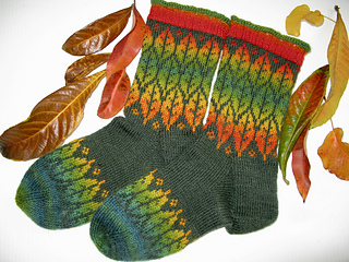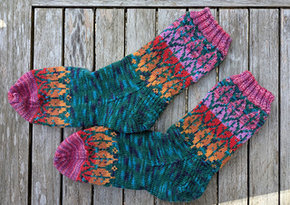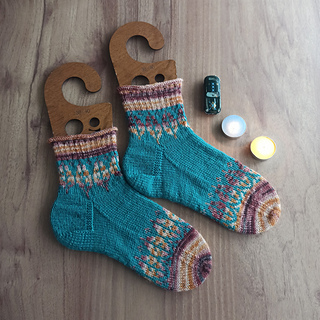 spacer These socks use traditional sock yarns in a wool and polyamide (nylon) blend. The CC is a yarn with a very long color gradient, which makes it nearly impossible to knit two identical socks from just one ball. Any matching weight/composition sock yarn in a gradient colorway will provide similar results. If you prefer to work two matching socks, choose a gradient yarn with a shorter gradient colorway.