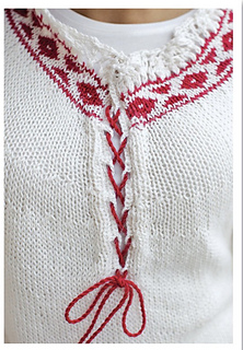 I’ve loved peasant blouses since the 1970s, when I discovered the beauty of folkwear sewing patterns, and I’ve wanted to make one ever since. I never did get around to sewing one, but this knitted design more than makes up for that. Inspired by the traditional clothing worn by Russian peasants, I worked the red and white patterning on the neck and cuffs in stranded knitting rather than embroidery. The lace pattern at the hem adds extra decorative flair. The blouse body and sleeves are both quite long, and are intended to be drawn in —at the waist with a drawstring and at the wrists with the wide cuffs-to form a graceful, flowing shape. The alpaca yarn is knit at a much looser gauge than normal to create a soft, flowing fabric, perfect for this blouse. The colorwork is knitted with smaller needles to provide more body.