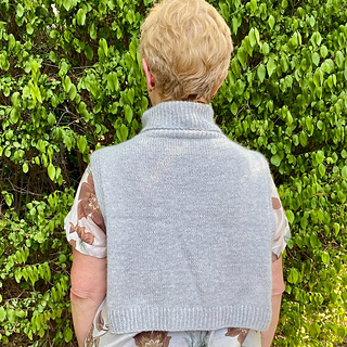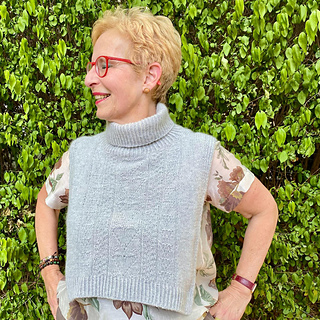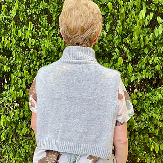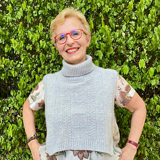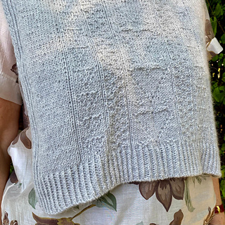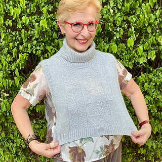 Il davantino “Sabrina” è una via di mezzo tra uno scaldacollo e un piccolo poncho ed è lavorato in piano.