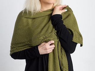This top‑down, semi‑circular shawl has Celtic twining cables and textured stitches. Stockinette wings and a trinity‑stitch center flow into a border of Celtic motifs framed by Irish moss rib. Worked in worsted, it knits up quickly into a warm, cozy wrap for winter.