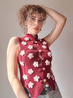 The Sakura Vest is a soft, handmade homage to Japan’s cherry blossom season. Each stitch grows like petals unfolding in spring, gentle increases shaping the body, a curved collar framing the neck, and tiny crochet flowers echoing the sakura that inspire its name. Light, delicate, and quietly romantic, the vest carries the feeling of a calm Japanese morning, where blossoms fall like snow and beauty appears in the smallest details.