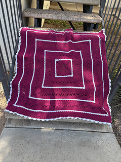 The blanket starts with the center square and grows with each round. Easy stitch patterns for the advanced beginner, but still fun for the intermediate level crocheter.