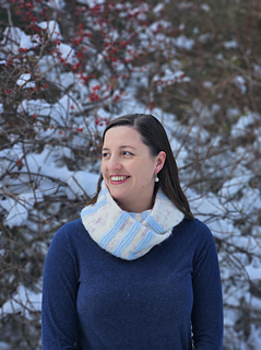 After beginning with a provisional cast on, the cowl is worked as a tube with alternating sections of stockinette in the main color and garter stitch in the contrast color. Once the tube is the correct length, the ends are joined with the kitchener stitch.