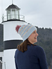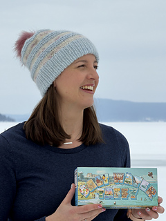 After beginning with a provisional cast on, the hat’s ribbed brim is worked until it can be folded and knit together with the cast on edge. The body of that hat is worked with alternating sections of stockinette in the contrast color and garter stitch in the main color. Decreases shape the rest of the hat, which can be topped off with a pompom.