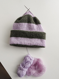 This beanie is knitted top-down in Stockinette stitch. You begin by working in the round as a tube, shaping the crown at each end before finally folding the inner layer into the outer one to create double thickness. Because the hat is worked from the top down, adjusting the length is simple—you can try it on as you go to make sure the fit is just right. After the crown shaping, the rest of the knitting is wonderfully relaxing, with soothing rounds of Stockinette.