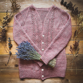 Ce cardigan se tricote de haut en bas, sans coutures. On commence par le col dos, puis on relève les mailles le long de son bord. Les diminutions raglan sont travaillées à partir de ces mailles, en tricotant simultanément le dos, les devants et les manches. Les panneaux de dentelle sont introduits progressivement jusqu’à atteindre leur largeur complète, puis se poursuivent sur le corps. Une fois les raglans terminés, les mailles des manches sont mises en attente et le corps se tricote en une seule pièce. Les diminutions de taille et les boutonnières sont travaillées tout en tricotant le corps, qui se termine par une longue bordure en côtes. Les mailles des manches sont ensuite reprises sur les aiguilles. Elles sont tricotées en rond avec des diminutions régulières, et terminées par un poignet en côtes.
