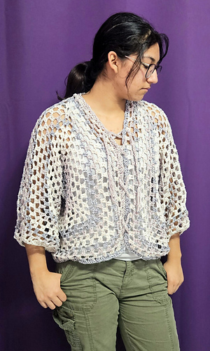 Tassel is optional. To mimic example, weave ends of tassel evenly in front of cardigan, beginning at bottom edge and working upward until half of length is reached.