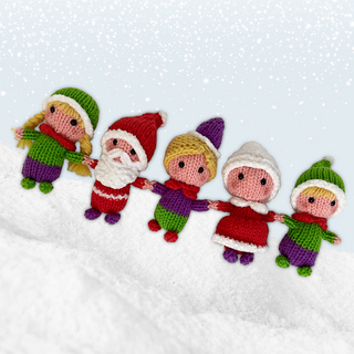 Santa and his helpers are lining up for the big day. These little dolls are joined at the arms to make a garland. They follow the same basic pattern in different colours and with different hats and hair. The group includes Santa, Mrs Santa and three elves.