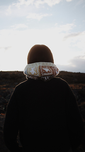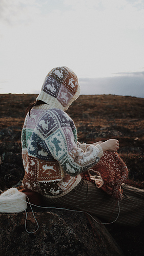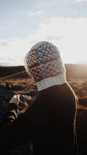This hood is constructed from knitted squares seamed together to create its shape. Its modular construction allows for easy modifications.
