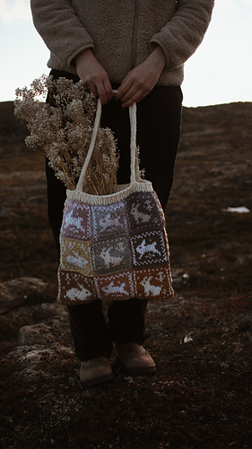 This tote is constructed from knitted squares seamed together to create its shape. Its modular construction allows for easy modifications. Increase the length by adding rows and increase the width by adding columns.