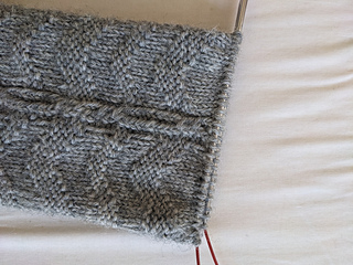 10 x 10 cm = 26 s x 36 krs. Sileää neulosta pyörönä neulottuna pingotuksen jälkeen.