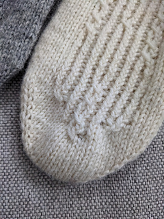 Toisessa vaihtoehdossa samat kierretyt silmukat ja palmikonkierrot muodostavat linnun jäljet - sillä mitäpä olisi Sauvosukat ilman naakkoja.
