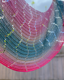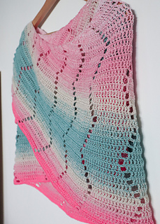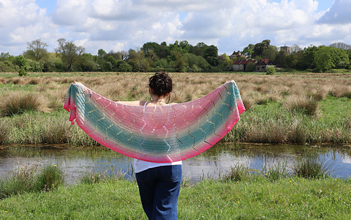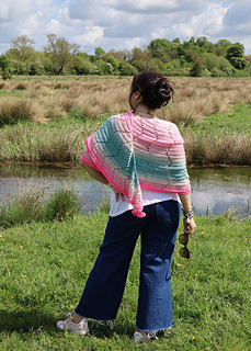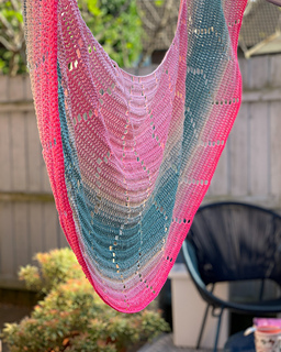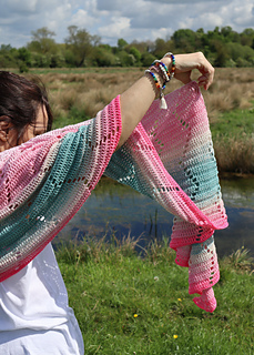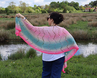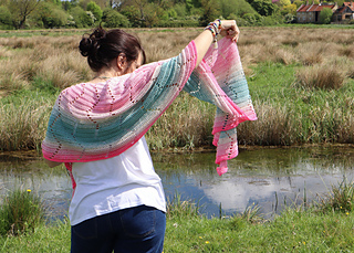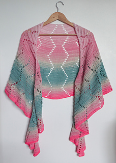 A generous crescent shaped shawl with gently diverging filet crochet zig zags, designed to work at right angles to the colour changes. An engaging and enjoyable crochet pattern with tons of drape for those who like something a little different.