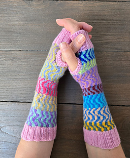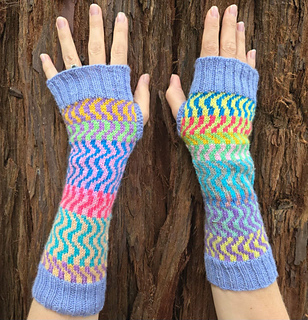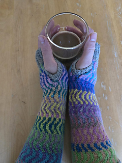 Construction method: The handwarmers are mostly knitted in the round from the bottom up, with a section knitted flat to provide a thumb hole. Very simple stranded knitting is used to provide the wave pattern in the stockinette section. The arm and hand cuffs are worked in 2 x 2 ribbing. Stitches are picked up round the thumb hole and the thumb cuff is worked in 1 x 1 ribbing.