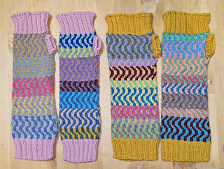 The two handwarmers are fraternal twins rather than identical ones to accommodate the full range of scraps. A family resemblance is maintained by matching cuffs (made from larger part-balls) and a two-color wave motif. Color harmony comes from using part-balls of leftover striped sock yarn throughout. The second color is provided by the smallest scraps - change color whenever you need to, and enjoy choosing color combinations.