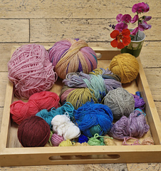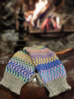 The handwarmers are a quick project which provides a simple introduction to stranded (Fair Isle) knitting. The end result has a cheerful, circus-like feel, and the stranding provides extra insulation.
