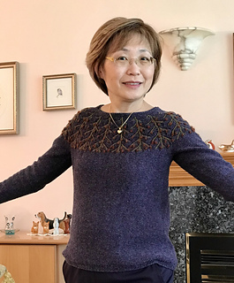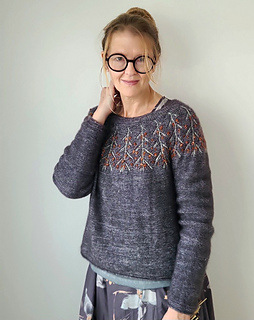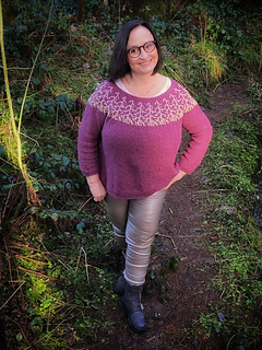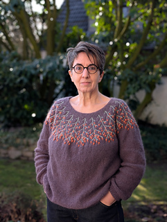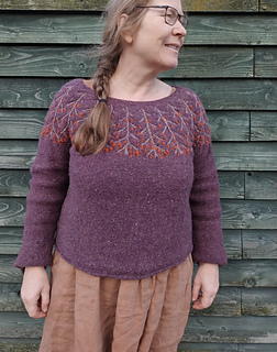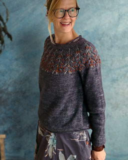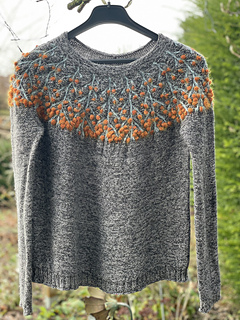 Der Sea Buckthorn Sweater ist ein top down gestrickter Pullover mit einem Einstrickmotiv aus Zweigen und Beeren.