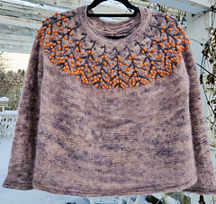 The Sea Buckthorn Sweater is a top-down knit sweater with a knitted motif of twigs and berries.