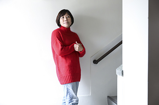 袖の目を拾い、袖口まで輪で編む。または、袖を別に編んで綴じつける.