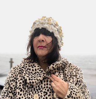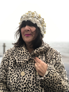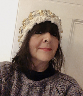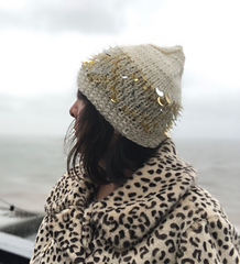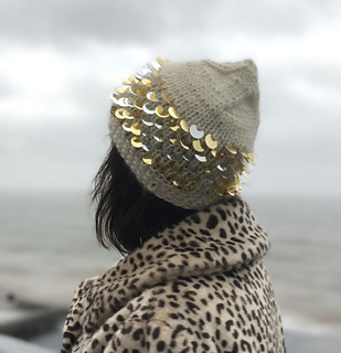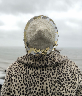 A cute bejeweled sequined hat, knitted in chunky yarn, with decreased stocking-stitch crown; giving an interesting concentric pattern, finished off with an optional I-cord tail.