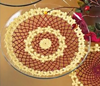 Round doily has mini yellow flower motifs arranged in a circle and dark red (or brown) mesh.