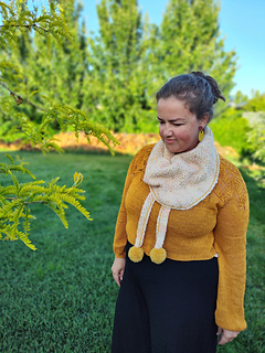 Worked from end to end in moss stitch then finished with extra large pompoms on each pointed end, this scarflette is a quick and easy make using just 150g of bulky weight yarn (plus some extra for your poms. I highly recommend using scraps for your poms, you can even use multiple colours for a fun speckled effect).