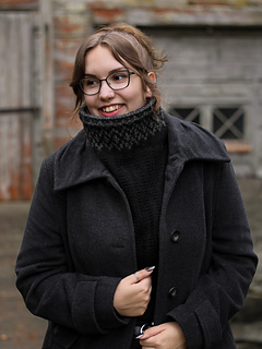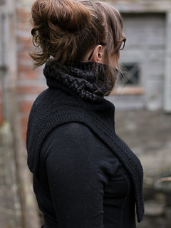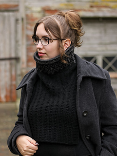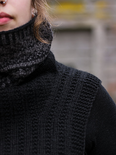 Shadow is knit top down, starting with the colourwork cowl worked in the round and continuing down to the back and front worked flat. The cowl includes a bit of textural interest in addition to the colourwork. There is some short-row shaping for the back of the neck as well as decrease shaping for the front and back. The pattern has a longer front, but both back and front lengths are easy to modify. This collar is the perfect pair for Echo mittens.